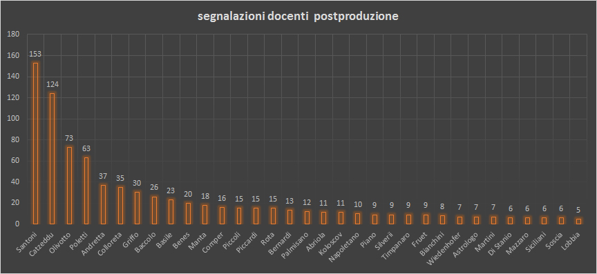 La tabella qui riportata riassume l'elenco dei docenti maggiormente segnalati (con almeno 5 segnalazioni), in ordine decrescente di numero di menzioni.