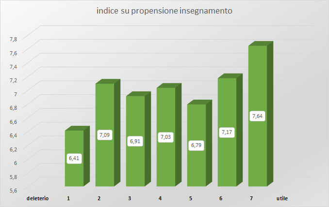 Quindi, il livello di soddisfazione professionale complessivo del gruppo "1" (i più contrari all'idea dell'insegnamento) ha un indice medio di soddisfazione di 6,41, mentre il gruppo più entusiasta all'idea di condividere (gruppo della colonnina corrispondente al "7"), ha un indice di soddisfazione generale pari a 7,64