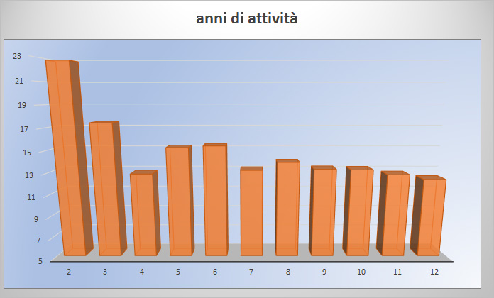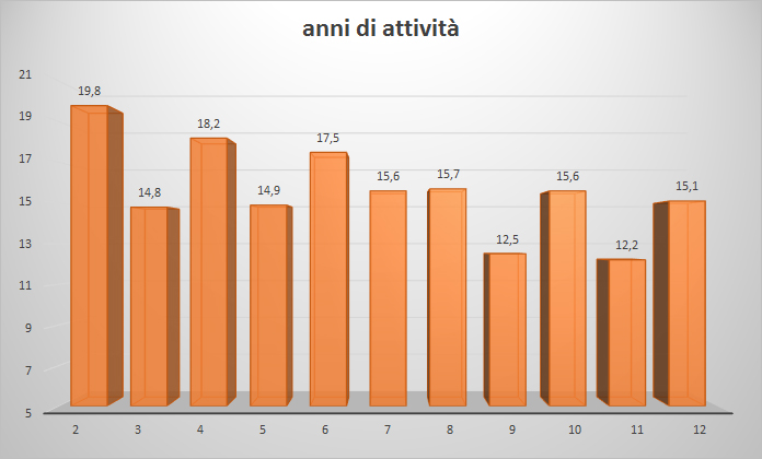 Mentre resta percepibile il fenomeno per il gruppo più sconfortato (indice: 2, con circa 20 anni di media dall'apertura dell'attività), la distribuzione inversamente proporzionale indica una marcata tendenza alla normalizzazione di questo dato.
