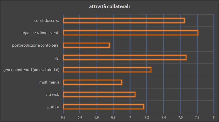 Buon "rating" anche per il tenere corsi e fare docenza (predisposizione all'assertività?) e per la competenza su CGI (computer generate imaging).