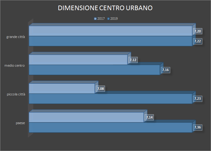 Nel confronto con lo scorso rilevamento, balza all'occhio il livellamento della percezione, in rapporto alle dimensioni del centro in cui si opera; qualche tempo fa, i centri intermedi erano un po' svantaggiati, rispetto alle grandi città ed ai piccoli paesi. Ora, salvo una marginale débacle dei centri medi, orientativamente la soddisfazione si equivale un po' ovunque.
