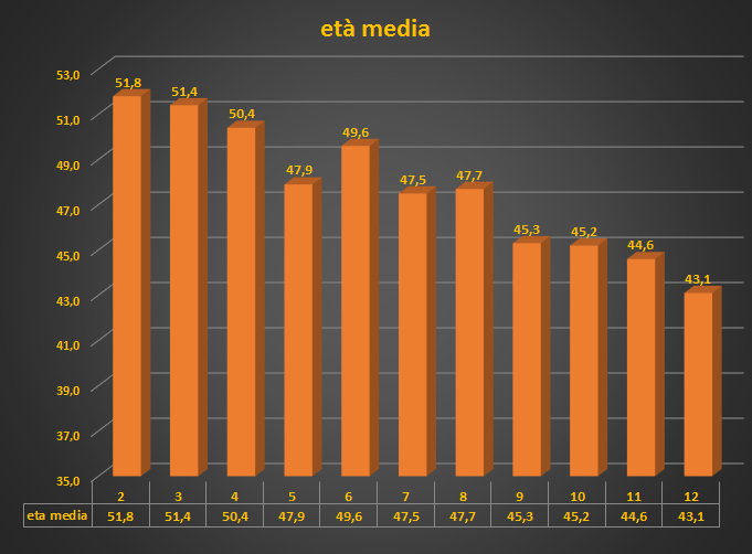 Anche se - ancora - nel gruppo più sconfortato (livello 2 e 3) l'età media resta più elevata, e nel gruppo di maggior successo (9, 10, 11 e 12) l'età media scende ai minimi, rispetto agli scorsi anni la distribuzione delle età diviene più normalizzata, evidenziando un maggior equilibrio.