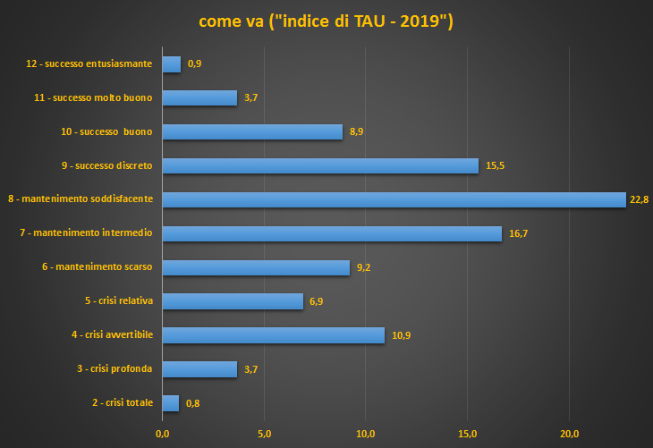 Analizzando sia il grado di soddisfazione personale, sia il grado di soddisfazione economica (quanto ti appaga umanamente, e quanto di rende economicamente il tuo lavoro in questo periodo) ad ogni scheda del sondaggio viene abbinato un "indice" (che giocherellonamente definiamo "Indice di TAU") che esprime - in una scala da 2 a 12 - il livello di soddisfazione complessiva.