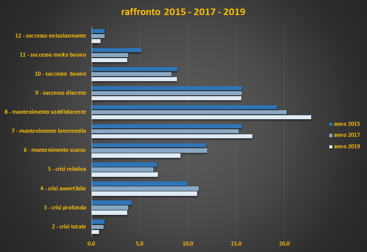 Di fatto, quindi, sono state evidenziate undici sfumature di "mix" fra soddisfazione personale e reddito conseguiti, raggruppate in tre grandi "tronconi": crisi, mantenimento e successo.