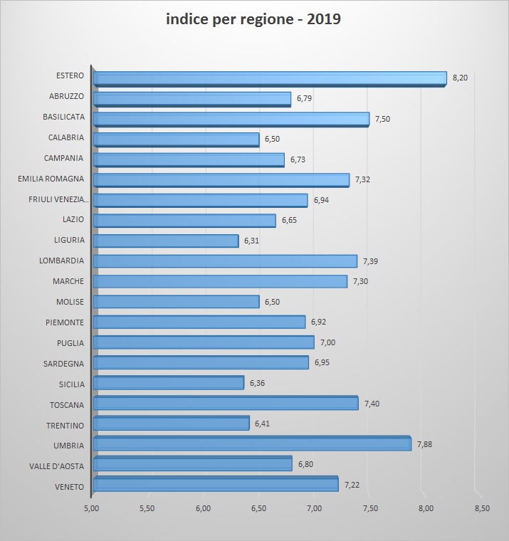 Essendo la media di soddisfazione di 7,25, le Regioni in cui è stata segnalata una condizione piu' disagiata sono: Abruzzo, Calabria, Campania, Friuli, Lazio, Liguria (quest'ultima fanalino di coda), Molise, Piemonte, Puglia, Sardegna, Sicilia, Trentino e Valle d'Aosta.