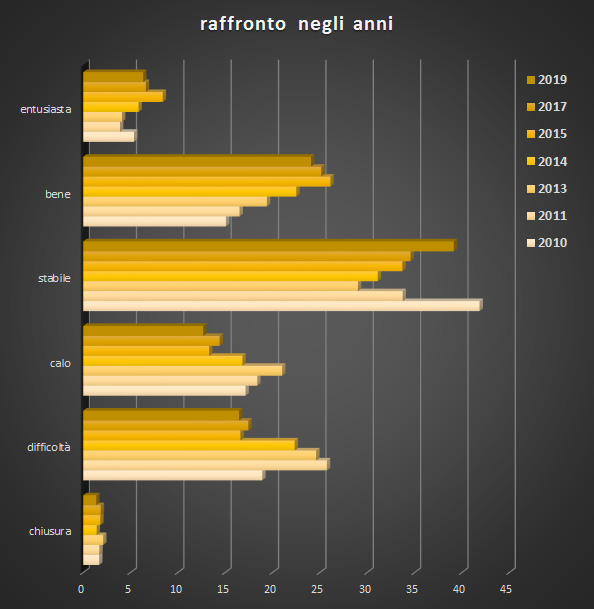 Nei "gradini" negativi (le prime tre colonne, indicate dalle posizioni in "chiusura", "difficoltà" o "calo") la percentuale di percezione negativa è molto maggiore sul fronte del reddito (colonna giallo oro); al contrario, nei gradini di sensazione positiva (indicate da "stabile", "bene" ed "eccellente") è la colonnina della soddisfazione personale (verde) ad indicare percentuali più elevate, rispetto a quella del reddito.