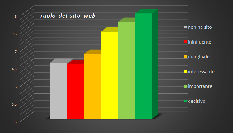 Questa è stata una sorpresa: esiste una relazione diretta fra l'importanza attribuita al sito e l'indice complessivo di soddisfazione. Chi non ha un sito o lo ritiene ininfluente, veleggia attorno ad un valore di indice di soddisfazione di 6,5 (media generale: 7,5); per contro, chi ritiene "decisivo" il proprio sito, si assesta attorno al 7,90.