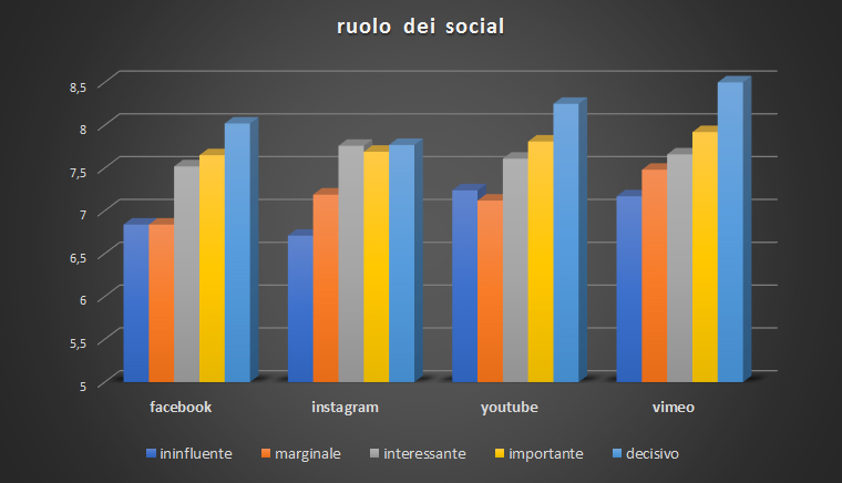 ... ma, al di là delle proporzioni numeriche - che ci siamo detti essere poco significative - è molto interessante notare che chi ritiene essere "importante" o "decisivo" Youtube e Vimeo (video di qualita') coincide con professionisti con un livello di soddisfazione sensibilmente più alto della media.