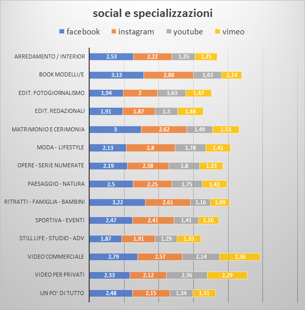 Questo significa che - ad esempio - fra i colleghi che si occupano di book per modelle/i (seconda riga), Facebook viene considerato fra "interessante" (3) ed importante (4), con una media di 3,13; Instagram ha una media di 2,88 (quasi 3, "interessante"); Youtube e Vimeo rispettivamente 1,63 e 1,14 (fra "ininfluente" e "marginale".