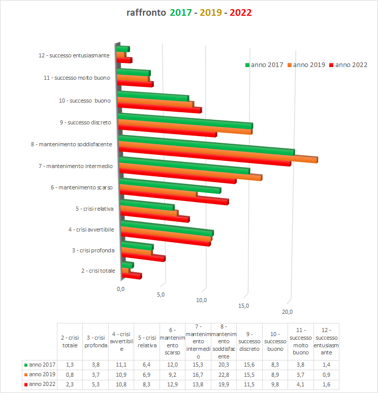 I gruppi in difficoltà (2, 3, 4 e 5 = crisi) sono passati da un complessivo 22.3% del 2019 ad un 26,7% del 2022; tuttavia, di converso, il gruppo di testa (9, 10, 11 e 12 = successo) è passato dal 29,0% del 2019 al 27% del 2022, con un calo relativamente contenuto.