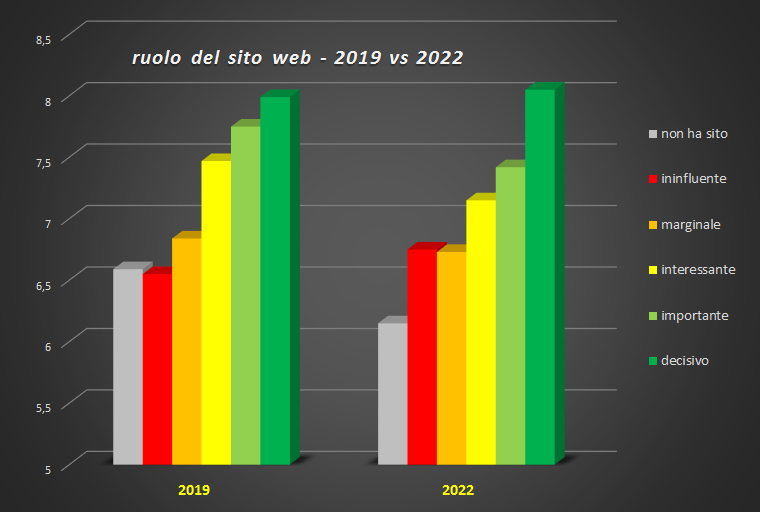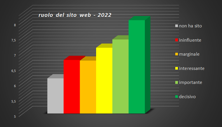 In realtà, i fatti dimostrano che esiste una relazione diretta fra l'importanza attribuita al sito e l'indice complessivo di soddisfazione. Chi non ha un sito o lo ritiene ininfluente, veleggia attorno ad un valore di indice di soddisfazione di 6,15 - 6,75 (al di sotto della media generale, che ricordiamo essere di 7,03); per contro, chi ritiene "decisivo" il proprio sito, si assesta attorno al 8,05.