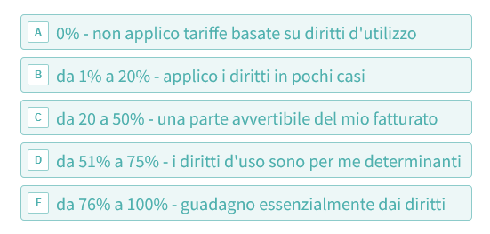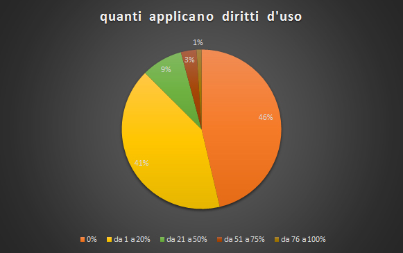 Circa il 46% (fetta arancione) non applica mai diritti d'uso, un 43% (fetta gialla) lo applica in una minoranza dei casi, e solo circa il 4% (fette marrone ed ocra) vede la maggioranza dei suoi proventi derivare dai diritti d'uso (va ricordato che ricade in questa categoria anche chi percepisce compensi da parte di agenzie stock).